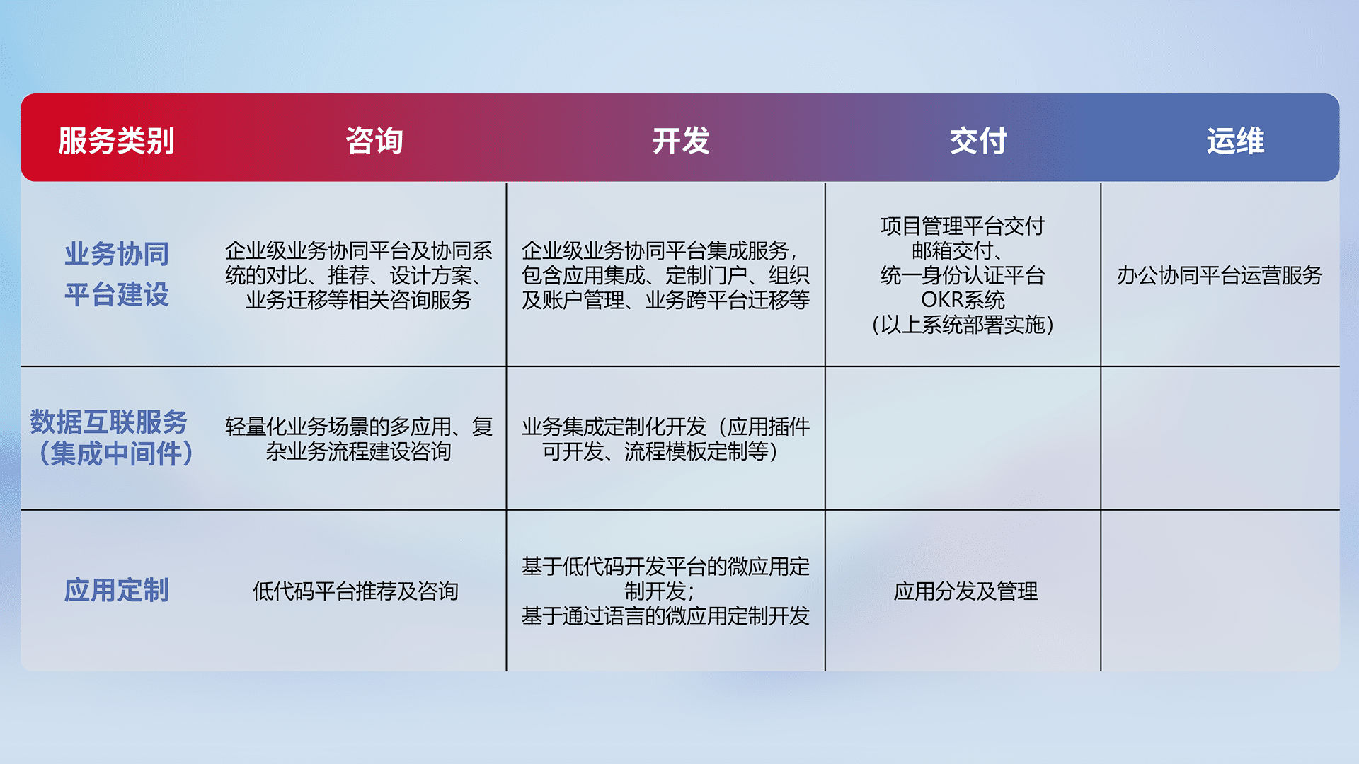 针对钉钉、、企微、、、IDaas等平台级产品提供产品的规划、、、方案、、交付、、定制化开发等服务,,,,实现如统一协同办公、、智能客户服务、、、、混合会议管理、、、智能数据查询、、、、等业务场景,,,实现数字化转型。。