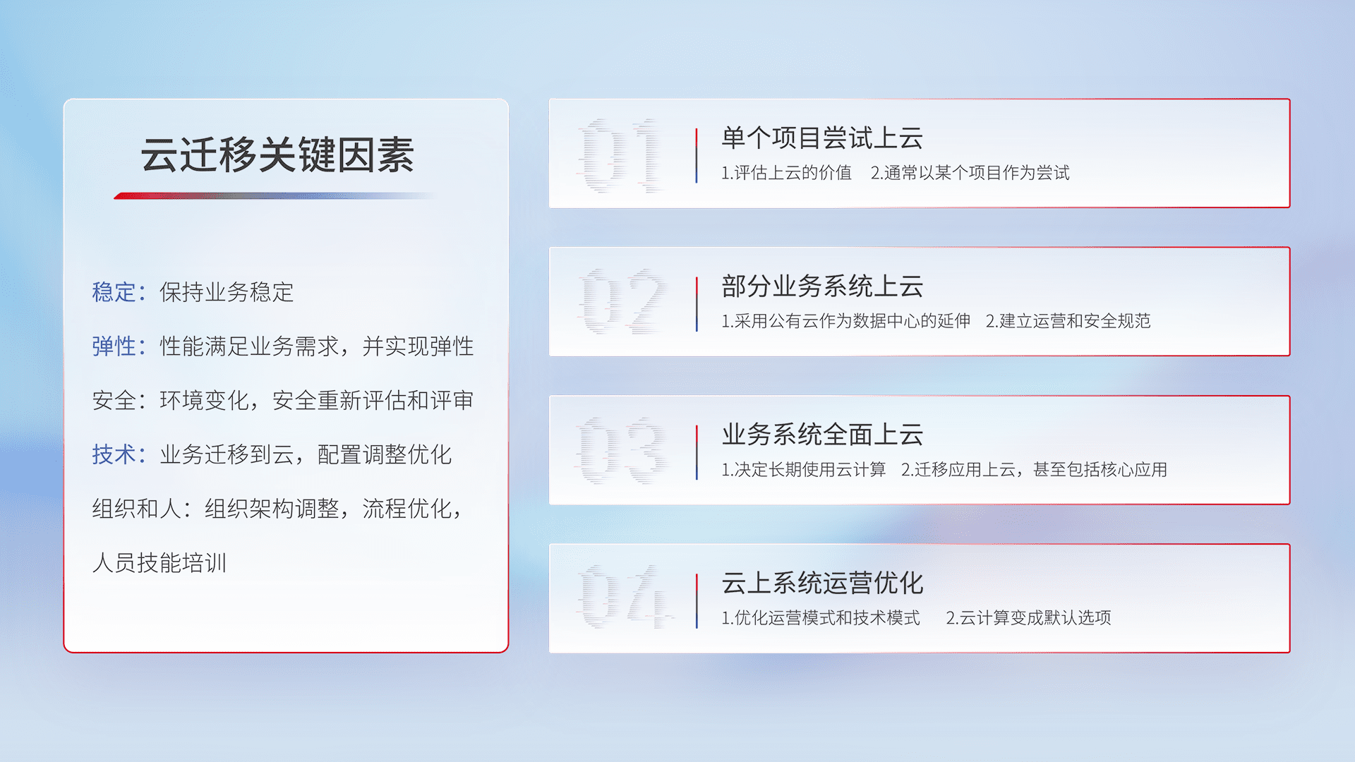 结合实际业务,,从规划设计、、、云平台选型、、、云原生改造、、、、数据迁移、、、集成交付,,迁移全过程为客户识别最佳上云路径,,做好风险识别管理,,设计网络架构、、、、身份权限、、、、安全审计合规、、、操作审计、、、日志审计、、监控告警策略、、、多站点容灾设计等,,,对云上基础设施进行整体规划,,提升IT治理水平,,,以满足弹性、、高可用、、高性能的需求。。。。